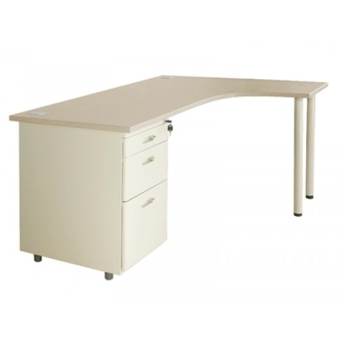 Bàn lượn góc phải, kèm với hộc sắt liền bàn. Chân trụ tròn. Mặt gỗ công nghiệp phủ melamine