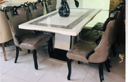Bộ bàn ghế ăn cao cấp khung thép mạ. Mặt bàn gỗ công nghiệp được phủ sơn PU cao cấp màu trắng bóng tạo cho sản phẩm sự nhẹ nhàng, thanh thoát. Đệm tựa ghế bọc PVC có may trang trí.